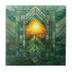 Schöne, Vintage Deko-Kachel mit geometrischen Mustern in Grün-, Türkis- und Goldtönen. Die Mitte der Kachel zeigt die Sonne.