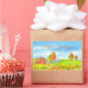 Ein fröhlicher Aufkleber für die Herbstsaison mit einer roten Scheune mit einem Kürbispflaster bereit für die Herbstdekoration und die Blätter ändern die Farben auf den Bäumen, gezeichnet in Farbe mit Aquarell. Spaß Weg, Herbstgrüße zu teilen!