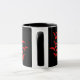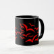 Diese Tasse mit Schwarz-Weiß-Ringer bietet eine Sammlung von einfachen Fledermausbildern, die in einem Wolkenmuster zusammenfliegen. Die Fledermäuse sind rot und der Hintergrund schwarz. Kinder sind sich sicher, dieses niedliche Design Liebe.