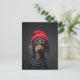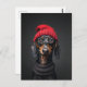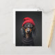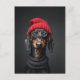 Eine charmante Dackel donnert eine rot gestrickte Mütze und einen gemütlichen braunen Pullover. Die ausdrucksvollen Augen und die aufmerksame Haltung des Hundes tragen zur liebenswerten und skurrilen Anziehungskraft des Fotos bei.