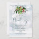 Eine elegante Winterhochzeit mit einer roten Beeren-Blumenschrift und eleganter Typografie auf einem Schneeflockenhintergrund mit den Details Ihrer Hochzeitswebsite und Ihrem QR-Code auf der Rückseite. Entwickelt von Thisisnotme©