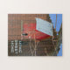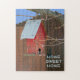 Zuhause Sweet Zuhause mit Foto eines roten Vogelhauses gegen braunen Zaun und blauen Himmel. Große Familienaktivität.