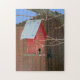 Ein Foto eines roten Vogelhauses gegen Holzzäune unter einem blauen Himmel.