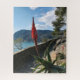 Blooming! Eine hübsche Pflanze Aloe Vera blüht auf dem bewaldeten Weg vom Schloss Monterosso al Mare zum Bahnhof. Die prächtige Blüte wird durch das tiefe Blau der Hügel jenseits und das azurblaue Ligurische Meer unterstrichen. Monterosso al Mare ist eines von fünf Dörfern in Cinque Terre, Italien.