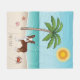 Desteis originelle Cartoon-Illustration einer niedlichen Rot-Weiß-Farbe Boston Terrier Rasse Hund stehend in einer tropischen Sommer Strand-Szene. Der beige Sand ist mit einer Palme, einer rosa Muschel, einem Seestern und einer roten Krabbe verziert. Das Wasser ist türkisblau mit einigen Wellen und die Sonne scheint über dem Horizont. Es gibt auch einen personalisierbaren Textbereich für einen Namen.