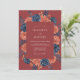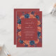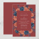 Rich, earthy red hues form the backdrop for a painterly display of deep blue and coral blossoms. Lush foliage intertwines with blooming roses, creating a romantic, textured atmosphere. This design evokes a feeling of rustic elegance and natural beauty.