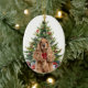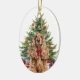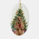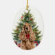 An der Vorderseite dieses Holiday-Ornaments befindet sich das Bild eines buffarbenen Cocker Spanierhundes, der einen festlichen roten Bogen trägt. Der Hund sitzt vor einem verzierten Holiday-Baum. Auf der Rückseite steht rot und grün "MERRY CHRISTMAS", und es gibt zusätzliche Textfelder, die Sie anpassen können. Lass es sagen, was du willst!
