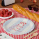 This coquette baby shower paper plate features a red bow on a cream background with Pale blue stripes. Personalize it for your needs. You can find matching products at my store.