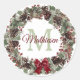 Ihr Monogramm in hellgrün und Name in Maronrot wird durch einen hübschen Aquarellkiefer und einen roten Beerenkranz gerahmt. Ein glänzender roter Bogen verleiht dem Kranz ein bisschen Weihnachtsfunkel. Ideal für Ihre Urlaubspakete oder Korrespondenz.