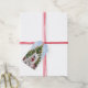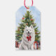 Auf der einen Seite dieses Weihnachtsgeschenktafels befindet sich ein Aquarell-Bild eines wunderschönen weißen Samoyed Hundes vor einem verzierten Holiday-Baum. Der Hund trägt einen hellen roten Bogen. Auf der Rückseite des Tags befindet sich ein Bild von leicht eingewickelten Geschenkpaketen, sowie ein eigener Text.