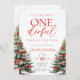 Red Bow Winter Onerderland Girl 1. Geburtstag Einladung mit Kiefern und Rot-Bogen Details.