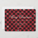 Rote karierte Urlaubskarte mit einem karierten Büffel in Rot und Schwarz mit Schneeflocken und Sternen.