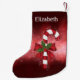 Desteis originelle Illustration einer rot-weiß gestreiften Weihnachtskandinenstube-Leckerei, die mit einem roten Bogen und einer Weihnachtsheiligen / Gemeinen heiligen Pflanze verziert ist. Der Hintergrund ist ein festlicher roter Knall. Es gibt auch einen personalisierbaren Textbereich für einen Namen oder einen anderen benutzerdefinierten Text.