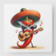 Ein fröhlicher, anthropomorpher Pfeffer aus rotem Chili, der einen großen Sombrero und schwarzen Schnurrbart trägt, während er eine Gitarre spielt
