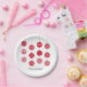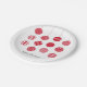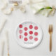 Ein Papierteller mit rot-weißen Weihnachtsbällen und einem "Frohen Weihnachtstext". Passen Sie die Papierplatte mit Ihrem eigenen Text, der Hintergrundfarbe unter anderem an.