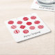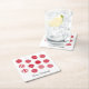 Ein Untersetzer mit rot-weißen Weihnachtsbällen und einem "Frohen Weihnachtstext". Passen Sie den Untersetzer mit Ihrem eigenen Text, der Hintergrundfarbe unter anderem an.