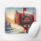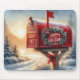 Ein festlich roter Briefkasten mit einem "Happy Holidays" Kranz steht in einer schneebedeckten Landschaft, beleuchtet durch das warme Licht der Sonne