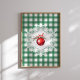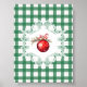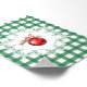 Klassisches Urlaubspopster mit handbemalten roten Ornamenten mit Farbband und Grün, Set vor grünem Gingham Karo Hintergrund. Die perfekte Dekoration für Weihnachtsfeiern, saisonale Party oder Bauernhausurlaub.