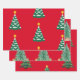 Rote Weihnachtsbäume verpacken Papierblätter mit 3 Designs. Dieses Set der Umhüllung Papierblätter umfasst Weihnachtsbäume mit Schnee, Geschenke und Dekorationen.