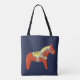 Die Red Dala Horse Tasche auf dieser Tasche ist aus einem hölzernen Pferd geschnitzt und von Julia Persson Morrill gemalt