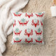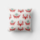 Rote Silhouette Hirsche und Hirschkopf mit dekorierten Antlers wechseln sich im Holiday-Muster auf diesem festlichen Kissen ab. Aquamarine Schneeflocken und das Joyeux Weihnachten bilden einen schönen Kontrast zum Rot. Alles wird auf weißem Hintergrund wiederholt. Beide Seiten des Kissens haben das gleiche Muster.
