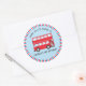 Vielen Dank an die Aufkleber mit einem roten Doppeldeckerbus, der von den Vintagen Londoner Bussen inspiriert wird. Ideal für die Londoner Geburtstagsparty oder Busse. Blaue, rote und weiße Streifen für die Dekoration im Hintergrund. Personalisieren Sie Ihre Party-Nachricht.