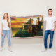 Ein fantasievoll roter Drache, der bei Sonnenuntergang ein Schloss bewacht.
