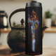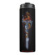 Ein kleiner, roter Drache sitzt auf einem Schwert und ihr Schwanz ist um das Schwert gewickelt