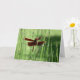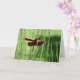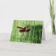 Notenkarte. Das Bild wurde innerhalb von 2 Sekunden aufgenommen, als diese atemberaubende rote Libelle auf einer strahlend grünen, stäbchenähnlichen Pflanze stand. Das leuchtende Rot ist spektakulär gegen das üppige Grün.