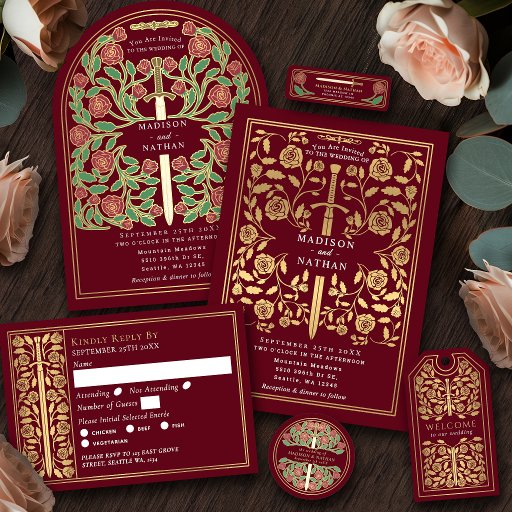 Celebrate your special day with this royal medieval fantasy wedding design featuring a sword surrounded by florals against a red background. You can customize this further by clicking on the "PERSONALIZE" button.