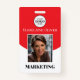 Lassen Sie sich von diesem lebendigen roten Mitarbeiternamen-Abzeichen abheben, das ein individualisierbares Foto, Logo und Name mit den Details der Abteilung bietet. Dieses elegante Design ist ideal für Marketing-Profis oder Unternehmen. Es bietet ein kühnes und dennoch berufliches Aussehen. Perfekt anpassbar mit Foto, Logo, QR-Code und Text für Konferenzen, Büros oder Veranstaltungen!