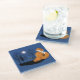 Ein roter Fuchs sitzt neben Kürbissen und Herbstblättern. Einige Herbstblätter fliegen hinter dem Fuchs in Richtung Wald