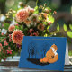 Ein roter Ochse sitzt neben Kürbissen und Herbstblättern. Einige Herbstblätter fliegen hinter dem roten Fuchs in Richtung Wald.