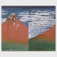 Die Szene aus dem japanischen Holzschnitt "Fine Wind, Clear Morning" (auch bekannt als "Red Fuji" oder "Aka Fuji") ist eine atemberaubende Darstellung des Fuji, der in den lebhaften Farben des Sonnenaufgangs gebadet wird. Dieses Kunstwerk ist Teil von Katsushika Hokusais berühmter Serie "36 Ansichten des Fuji", die zwischen 1830 und 1832 erschaffen wurde. - Ein Holzschnitt, auch bekannt als mokuhanga (木 版 画) auf Japanisch, ist eine einzigartige Kunstform, die durch das Schnitzen eines Designs auf einen Holzblock entsteht. Die erhöhten Teile des Holzblocks werden dann mit Tinte auf Papier gedrückt, um das Bild zu übertragen. Diese Technik resultiert in Drucke, die für ihre fetten Linien, krassen Kontraste und flache Farbbereiche bekannt sind. — Hokusais "Red Fuji" setzt diese Technik meisterhaft ein. Der majestätische Fuji dominiert die Szene, sein Gipfel mit unberührtem Schnee, der gegen den klaren blauen Himmel glänzt. Wispy Wolken treiben durch die Azurblüte und deuten auf eine sanfte Brise hin. Der auffälligste Aspekt des Drucks ist der Berg selbst, gebadet in einem feurigen Rot, das die brennenden Morgenröte hervorruft. Dieser dramatische Farbgebrauch ist ein Kennzeichen von Hokusais Werk und verleiht der Szene eine beinahe mythische Qualität. — Die Ausläufer des Fuji entfalten sich wie ein Wandteppich üppiger grüner Wälder, der auf dichte Wälder mit Leben hindeutet. Diese grüne Decke kontrastiert wunderbar mit der schneebedeckten Spitze, die der Szene Tiefe und Dimension verleiht. Hier, unter dem wachsamen Blick auf den Fuji, ein Ökosystem gedeiht, sein reichhaltiges Grün, das auf die versteckten Wunder hindeutet, die sich am Fuße des Berges entfalten. Diese grüne Tapisserie verbirgt einen sagenumwobenen Wald, bekannt als Aokigahara Jukai (青 木 原 海), der auf Englisch als "Treppenmeer" übersetzt wird. Diese weitläufige Baumlandschaft ist nicht nur für ihre Schönheit bekannt, sondern auch für ihre Folklore. — Legende flüstert von der Aokigahara Jukai ein Ort, der von einer spirituellen Energie durchdrungen ist, einige sagen sogar eine melancholische. Folklore erzählt von Yuurei (幽 霊), rachsüchtigen Geistern, die inmitten der dichten Bäume bleiben. Ob Wahrheit oder Lagerfeuer, das dichte Blattwerk und die ungewöhnlichen magnetischen Eigenschaften des Aokigahara Jukai, die Kompasse zur Funktionsstörung verursachen können, tragen zu seiner geheimnisvollen Aura bei. — Teil von 36 Views of Mount Fuji serie von Artist Katsushika Hokusai verabredet von 1830 bis 1832. Der Autor starb im Jahr 1849, dieses Werk ist im öffentlichen Bereich in seinem Herkunftsland und anderen Ländern und Gebieten, wo das Urheberrecht Begriff ist das Leben des Autors plus 100 Jahre oder weniger.