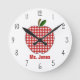 Eine Uhr für Lehrer mit einer Abbildung eines roten Gingham-Apfels. Personalisieren Sie den Namen Ihres Lehrers in rot.