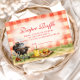 A cheerful backyard BBQ design featuring a bold red gingham background and hand-painted watercolor grill scene. Smoky charcoal grill, stacked burger, fresh lemonade, and picnic details create a warm summer gathering atmosphere. The layout keeps the upper area clean and bright for event details while the illustrated cookout scene anchors the bottom with rustic charm. Perfect for a casual outdoor baby shower with classic picnic style.