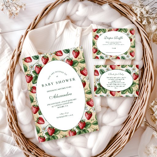 A sweet and timeless baby shower design featuring a soft cream center framed by a lush strawberry vine pattern. This botanical cottage-garden style combines gentle greenery, delicate berries, and a warm vintage tone for an inviting, storybook feel. Perfect for spring or summer celebrations, this design adds natural charm and a fresh, feminine touch to your baby shower. All details can be personalized to match your event.