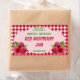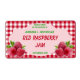Roter Gingham Hintergrund mit einem rechten unteren und links Eckelement einer Gruppe von 3 Himbeeren. Vier Gruppen von anpassbarem Text in der Koordination von Farben rot und frisch grün.
