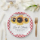 Roter Gingham Hochzeitspapier Teller mit Sonnenblumen-Blume und Streichleuchten auf einem rot karierten Hintergrund. Matching Artikel zur Ergänzung dieser rustikalen Blumenzettel Teller. Individualisieren Sie sich ganz einfach auf jeden Anlass.