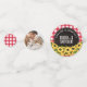 Rustikale rote Gingham Grillen Baby Duschtisch Konfetti mit Sonnenblumen, roten Gingham, ein niedliches Herz, und zwei Fotos.