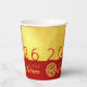 Modernes Design mit goldfarbenem Texturpapier (gedrucktes Bild) mit senkrechten goldenen chinesischen Wünschen + große 2026 in rot + kleines Pferdepapier geschnitten mit gelben Texten GLÜCKLICHES NEUES JAHR und Jahr des Pferdes auf einem roten Hintergrund. Design auf Papiertasse. Sie können das Jahr ganz einfach ändern, indem Sie auf die Schaltfläche Anpassen klicken. Matching Grußkarte, Urlaub Postkarte und mehr bald... Ideal für ein zeitloses und modernes chinesisches Neujahr des Pferdes 2026.