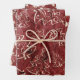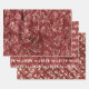 Elegantes Weihnachtspapier im Vintagen Stil in einem 3-Blatt-Set. Blatt 1 ist ein Vintages Design von goldenen Weihnachtsbäumen auf bordeauxrotem Hintergrund. Blatt 2 hat den goldenen Text "Joy" gemustert auf demselben bordeauxroten Hintergrund. Blatt 3 hat elegante goldene Blätter auf bordeauxrot/rot.
