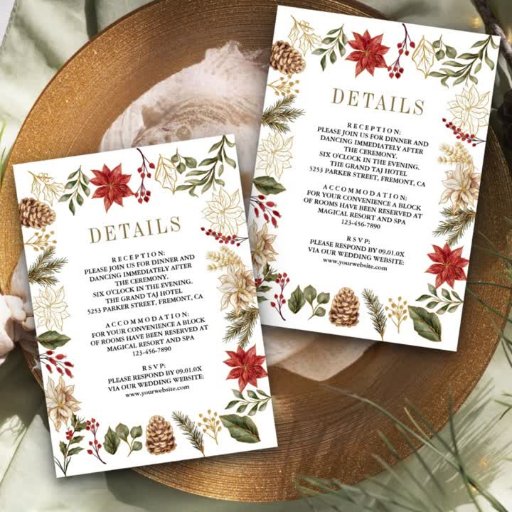 Erleben Sie Ihren Gast mit dieser eleganten Hochzeitsveranstaltung mit wunderschönen roten Poinsettia-Blume und rustikalen Kiefernpfannen-Blätter mit QR-Code für Online-UAWG. Fügen Sie einfach Ihre Veranstaltungsdetails zu dieser benutzerfreundlichen Vorlage hinzu und schmücken Sie diese Karte mit Ihren bevorzugten Fotos, um sie zu einer einmaligen Einladung zu machen.