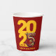 Feiern Sie das Jahr der Schlange 2025 mit diesen Papiertassen, die das Jahr 2025 in einem fett hellgelben Schriftart gestylt haben, und AI-generierten Kunstwerken einer stilisierten asiatischen Schlange, die für die Nummer 5 künstlerisch stehend auf königlichem rotem Hintergrund ist. Passen Sie das Messaging auf Wunsch an. Umkehrung zeigt identisches Design. Design © W.H. Sim. Weitere Informationen unter zazzle.com/word2art