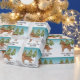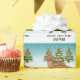 Desteis originelle Cartoon-Illustration eines niedlichen mahagoniroten oder rötlich-braunen Golden Retriever Rasse Hund. Der Hund befindet sich in einer Winterlandschaft mit drei grünen Tannenbäumen. Der Hintergrund ist ein blaues bis weißes Gefälle, das das Design des kalten Wintertages verleiht. Es gibt einen personalisierbaren Textbereich, der jetzt lautet: "Frohe Weihnachten!" zusammen mit einem individuelle Name.