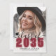 Classic Modern Graduation Announcement. The front features a full-page photo with a white gradient at the bottom that fades seamlessly into the image. Over the gradient, "2026" appears in a bold maroon, crimson, or red classic school-style font. Just above it, "Class of" is written in elegant black script. To the left of the year is a small, customizable graduation cap icon. Below the year, the graduate's name and school name are prominently displayed. All colors can be customized to match school colors or personal preferences.