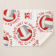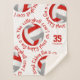 This cute volleyball themed sherpa fleece blanket features 5 randomly arranged red, gray and white volleyballs with the text, "The volleyball court is my happy place" in red encircling each volleyball in a fun typographic font, all on a white background - her name and jersey number are customizable - by katz_d_zynes