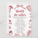 🍕 Bringen Sie Ihren Babydusche einen Hauch italienischen Charmes mit dieser roten italienischen Pizza & Pasta Doodle "Wäre Sie lieber Spiel!"! Handgezeichnet mit Pizzaslicen, Nudeln und festlichen roten Akzenten wird dieses Spiel die Gäste zum Lachen und Räumen bringen, während sie versuchen, die Vorlieben der Mama-to-be zu erforschen. Ideal für ein gemütliches italienisch-inspiriertes Fest, es ist leicht zu drucken und ein lustiger Weg, das Eis zu brechen! ❤️ 🎉 👶