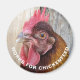 Humorous, round style magnet for the home or work office that features the photo image of a red chicken hen along with the words, WORKS FOR CHICKENFEED printed in bold, white lettering.