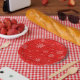 Traditioneller, roter und weißer Snowflake-Urlaubstext von BigTexFunkadelic ™️. © 2019 BigTexFunkadelic